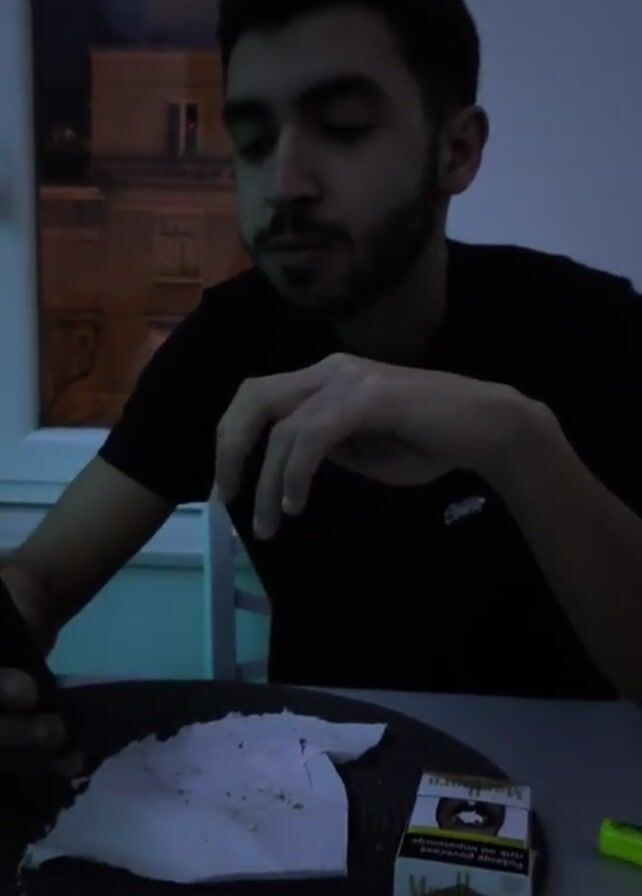 A man is sitting at a table, using his phone to take a selfie. There is a crumpled napkin with crumbs on the table, along with a pack of Marlboro cigarettes and a yellow lighter. A building is visible through the window in the background. The lighting is dim.