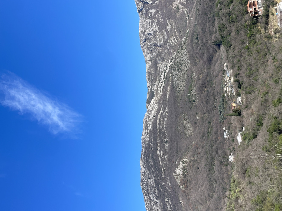 This image presents a panoramic view of a mountainous landscape in Zagrađe, Montenegro, under a clear, bright blue sky. The sky occupies the upper third of the frame, featuring a single, elongated, wispy white cloud positioned diagonally in the upper-left quadrant. The middle ground and background are dominated by a large mountain range. Its upper sections are characterized by greyish-white rocky formations displaying visible horizontal strata and sparse vegetation. The lower and mid-slopes of the mountains are densely forested with deciduous trees, which appear bare and dark brown-grey, indicative of a dormant season. Scattered patches of evergreen foliage are also discernible. Nestled within these lower, forested slopes, the settlement of Zagrađe is visible. A cluster of light-colored, predominantly white, residential buildings is prominent in the mid-left area of the lower frame. Towards the center-right of this cluster, a structure with a dark-tiled roof and lighter walls is evident, situated near a tall, dark coniferous tree. In the bottom-right corner, a multi-story building, possibly under construction, exhibits exposed brickwork, reddish-brown roof tiles, and multiple balconies. Faint utility lines are visible traversing the mid-slopes of the mountain on the right side. No individuals or specific human activities are depicted. The scene is illuminated by bright daylight.