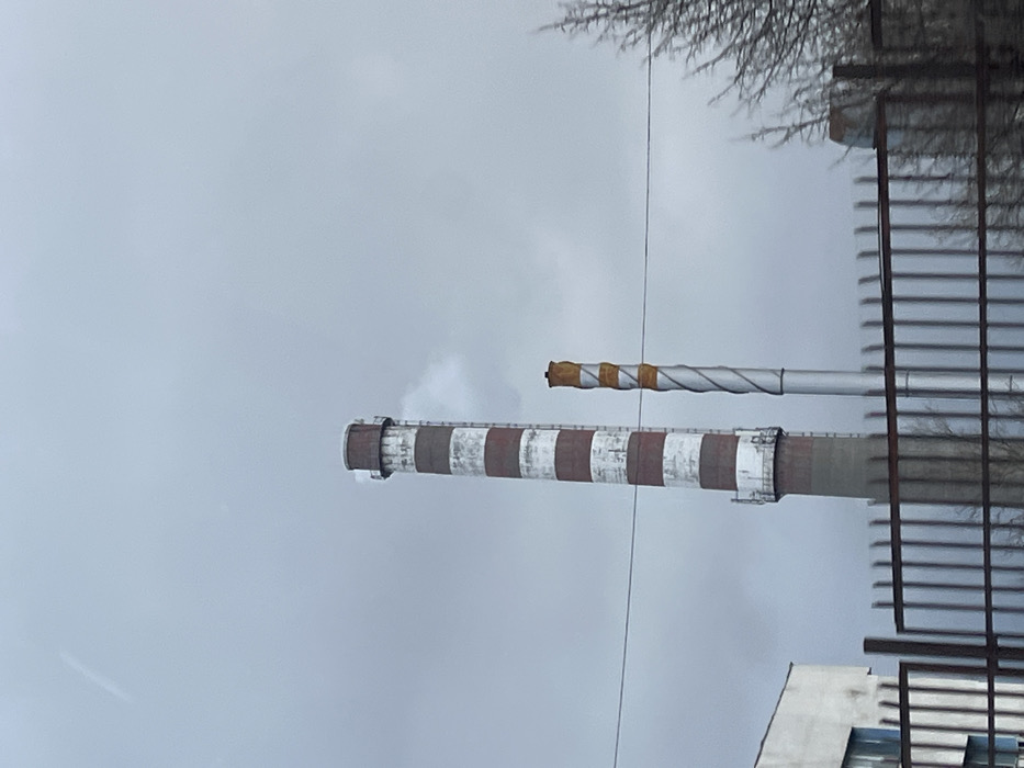 This image depicts an industrial scene at the Varna Thermal Power Plant in Varna, Bulgaria, under an overcast sky. Two prominent industrial chimneys dominate the central and right portions of the frame. The taller chimney on the left is cylindrical, featuring alternating horizontal bands of faded red-brown and off-white paint, indicative of wear. A platform structure is visible near its top, and a plume of light grey vapor or smoke is emanating from its aperture. A second, smaller platform is present lower down on this chimney. To the right of the taller chimney stands a second, thinner, grey cylindrical chimney. Its upper section is characterized by a distinctive spiral pattern of faded yellow-orange material, possibly insulation or a structural element, which appears somewhat degraded at the very top. In the foreground, a dark, vertical-bar metal fence with horizontal supports stretches across the lower third of the image, partially obscuring the base of the structures. To the far left, a section of a light-colored, possibly concrete or stucco, industrial building is visible. To the right, beyond the fence, the bare, leafless branches of deciduous trees are evident, suggesting a colder season. The sky above is uniformly grey and overcast, providing a diffuse lighting condition. No human figures are present.