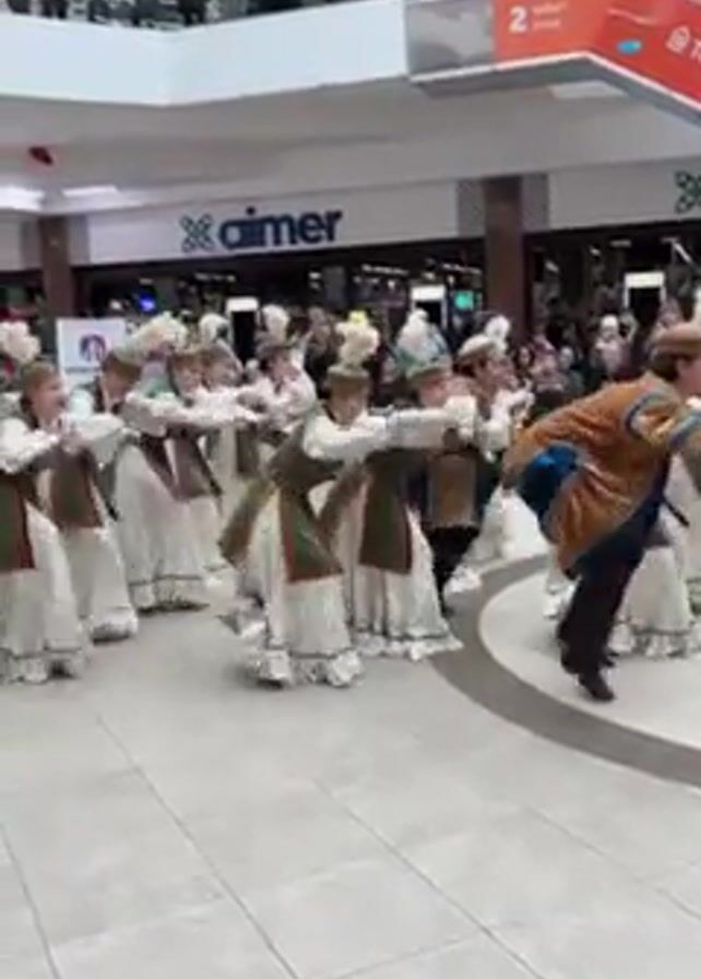 A dance group of young people performs a traditional dance inside a shopping mall. The dancers, mostly young women, are dressed in traditional costumes with white and patterned dresses, green vests, and feathered headdresses. Some male dancers wear brown and blue outfits. They move in a circle, raising their arms and performing synchronized steps. The dance takes place in a large open space in the mall, with shops and escalators visible in the background. Spectators are watching from the upper levels of the mall. Signs for "OSTIN" and "TechnoDom.kz" are visible, as well as the "aimer" store.