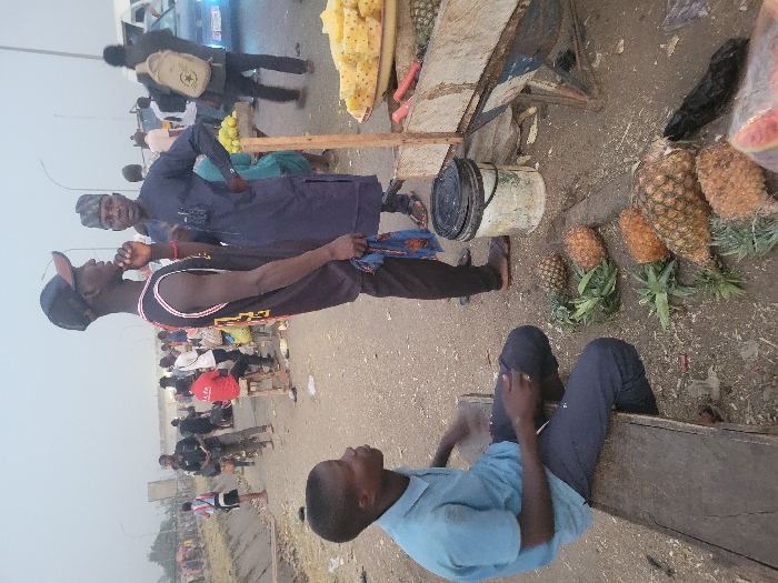 A street scene shows a man sitting on a wooden plank with a light blue shirt and dark pants. Nearby are two standing men in conversation. One wears a black and red basketball jersey with a cap, the other wears a dark blue robe and cap. A fruit stand displays cut pineapple and whole pineapples. People walk by in the background. A car is slightly visible.