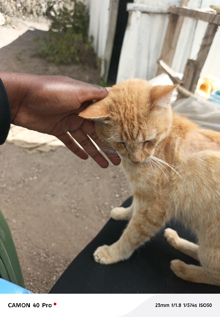 In Oloosirkon/Sholinke ward, Kenya, an outdoor scene is captured featuring a close interaction between a human and an animal. A dark-skinned left hand, partially visible and wearing a dark long-sleeved garment, is gently resting on or petting the head of an orange tabby cat. The cat, with prominent white whiskers and a light orange fur pattern, is positioned with its head slightly lowered and eyes appearing closed or downcast. It sits on a dark, possibly black, padded surface. In the foreground, a portion of a bright blue object and a green object are visible to the left. The background consists of a light brown, gritty or gravel-covered ground, with blurred green foliage and rustic, light-colored wooden structures or fencing visible further back. The scene is illuminated by natural light, casting subtle shadows.