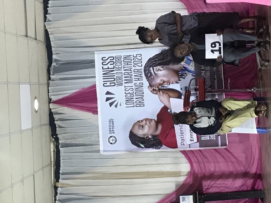 A banner promotes a Guinness World Record attempt for the "Longest Marathon Braiding Hair 2025," alongside official logos