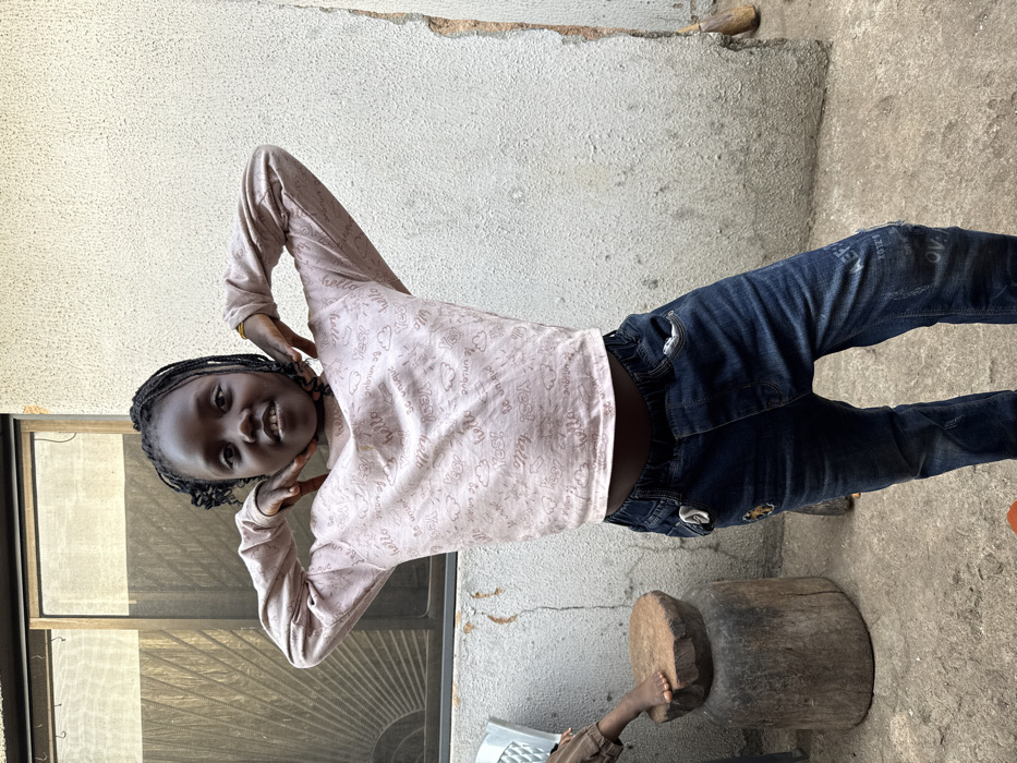 A young girl poses outdoors, wearing a long-sleeved pink shirt with the words "hello," "be unique," and "yes" repeated in the design