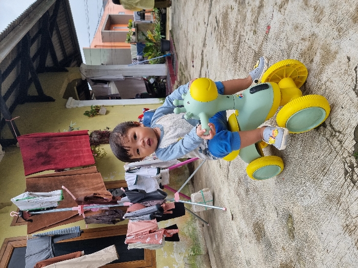 A young child, appearing to be a toddler, with dark hair, wears a light blue and white long-sleeved shirt, blue pants, and grey shoes with yellow embellishments. The child sits astride a green and yellow giraffe-shaped ride-on toy on a textured concrete surface, looking directly forward. Behind the child, a light yellow building with a brown wooden window frame and a dark corrugated roof overhang forms the immediate background. Various garments, including towels (one brown, one red) and shirts, are drying on a clothesline strung across the window and on a pink A-frame drying rack. To the right, a white decorative column is visible near a doorway. Further in the background, an orange-colored residential building is partially visible, along with potted plants and a person in a light yellow garment on the far right. This scene is located in a residential area of Pacet, Indonesia.
