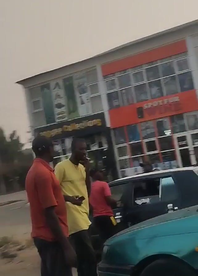 n intersection on what appears to be a busy street. Several people are standing near cars on the side of the road. The buildings in the background include a store called "Lassgee Collections." A traffic light with a yellow arrow is visible. The video is shaky and the focus shifts, making it difficult to see details. People are seen interacting near the cars. The video ends with several cars stopped at the intersection.