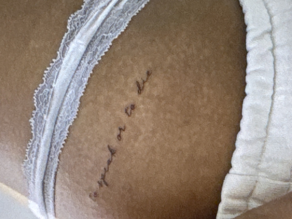 A close-up image displays a segment of human skin, consistent with an upper torso or lower back, exhibiting a medium-to-dark complexion. A black cursive tattoo reading 'to speak or to die' is present on the upper-central portion of the visible skin. Along the upper edge of the frame, a white lace trim, characteristic of an undergarment, is visible. The lower edge of the frame reveals a band of white, textured fabric, resembling a waistband. The scene is located in a private, indoor environment within the city of Unknown, Unknown.