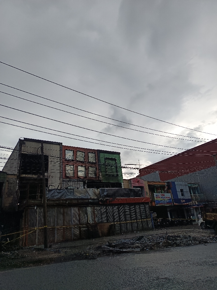 A static, wide-angle photograph taken in Sirnagalih, Indonesia, displays an urban street scene under a heavily overcast sky. The foreground shows a dark asphalt road with a mound of dark debris, consistent with fire remnants, situated on the roadside. The left and center-left midground feature a two-story commercial building complex exhibiting severe fire damage. The leftmost section of this complex is heavily charred, with blackened walls and missing window panes, exposing internal structural elements. Adjacent to it, a two-story structure with sections of faded red/orange and green facade also shows fire damage, particularly on its ground floor which is obscured by corrugated metal sheets and appears structurally compromised. Yellow caution tape is horizontally strung across the lower front portion of these damaged buildings. Multiple black utility lines traverse the upper half of the frame. To the right, a series of multi-story commercial buildings, featuring facades in shades of pink, yellow, blue, and grey, and topped with red-tiled roofs, appear largely undamaged by fire. Commercial signage, including a blue sign with white text reading "TOKO MAMA," is visible on these intact structures. A white motorcycle is parked on the street on the far right, near a partially visible yellow vehicle. No individuals are present in the scene.