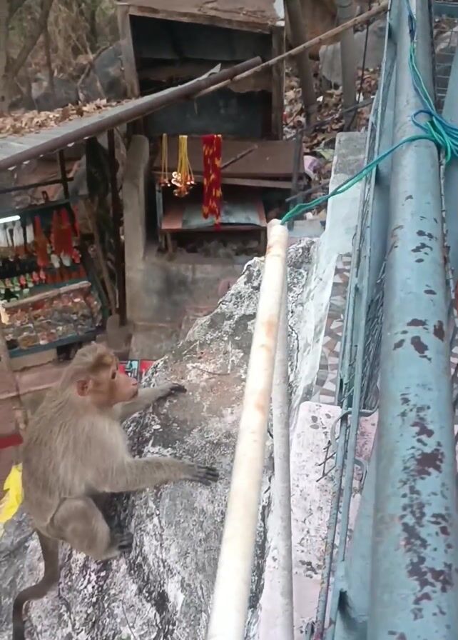 A dog on a patterned tile balcony barks at a monkey climbing a rock outside the railing. The rock is next to a small shop, likely selling religious items.