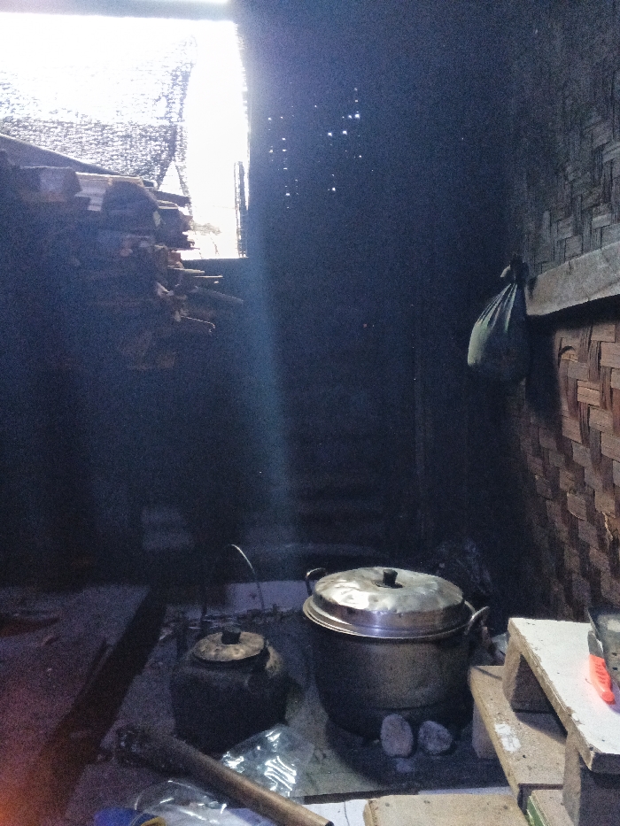 This image captures an interior scene in Na Sangkham, Laos, characterized by low light with a prominent external light source. A strong, diagonal beam of light enters from an opening in the upper left, illuminating airborne particles. To the upper left, a stack of cut wood or timber is piled. The right wall is constructed from woven material, likely bamboo, with a horizontal wooden beam from which a dark green bag hangs. On the earthen floor in the center, a dark, lidded pot sits to the left of a larger, metallic two-tiered steamer pot, which rests on several stones. The lower left foreground contains a wooden stick, clear plastic bags, and a faint orange glow from an unidentifiable source. No individuals are present within the frame.