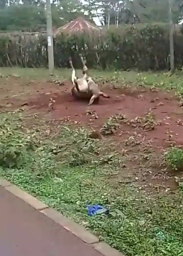 two donkeys in an outdoor area. One donkey is lying down on a patch of dirt, while the other stands a short distance away. There is a road in the foreground, and vegetation and trees in the background, along with a hut-like structure.