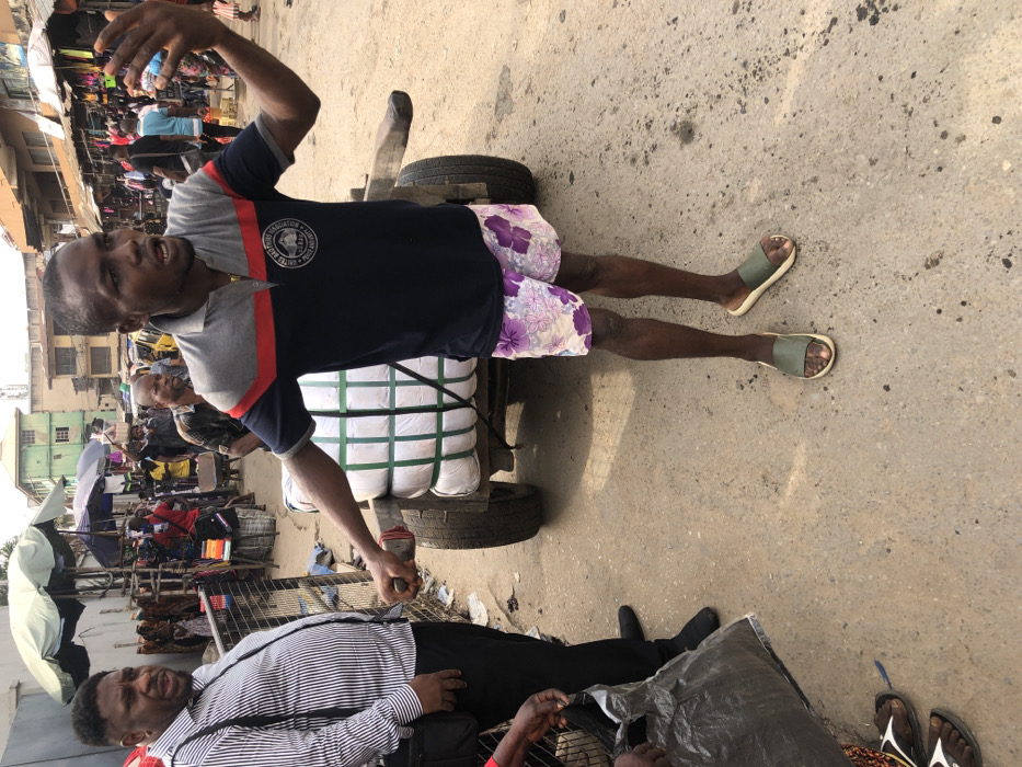 The image depicts a bustling outdoor street or market scene in Onitsha, Nigeria, under bright daylight