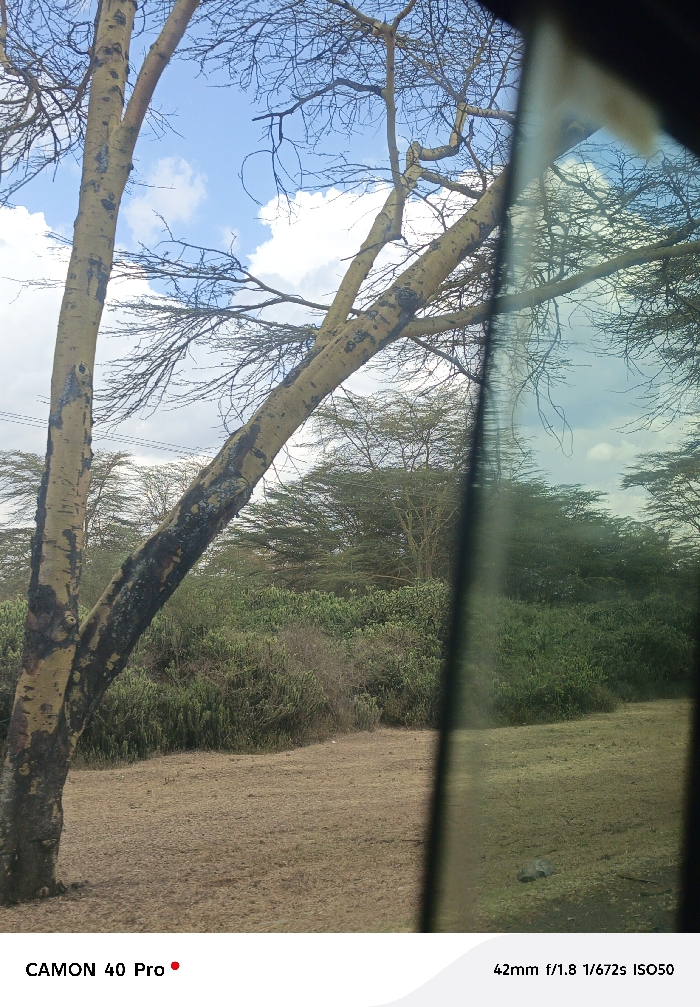 The scene depicts an outdoor landscape in Kitengela ward, Kenya, viewed partially through a reflective, tinted window, likely from a vehicle. The left two-thirds of the image show the direct view. In the foreground, two prominent trees with light yellow-tan bark stand on dry, light brown ground. Both trees exhibit significant dark, irregular patches on their lower trunks and are largely devoid of leaves, with numerous bare branches extending against a partly cloudy blue sky. The left tree trunk is mostly vertical, while the right one leans diagonally from the lower left towards the upper right. In the midground, a dense belt of green to olive-green shrubs and smaller trees is visible. Further in the background, more trees with light green foliage form a horizontal line under the sky. Faint dark lines, possibly power lines, are present in the upper left. The right third of the image is dominated by a dark, vertical, reflective surface, which appears to be a tinted vehicle window. This surface reflects parts of the sky and bare tree branches, while the lower portion offers a darker, greener, and slightly muted view of the ground and vegetation through the tint. No people, animals, specific actions, or interactions are visible. The environment suggests an arid or semi-arid bushland or savanna.