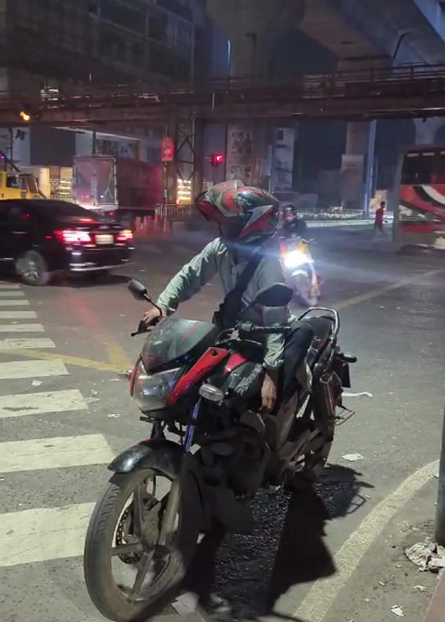 - "A man wearing a red helmet and a light-colored shirt sits on a black motorcycle at a crosswalk in a city at night" by FM-9iqtw2, licensed under CC BY 4.0