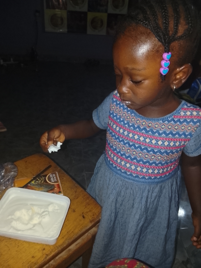 A young African-American girl in a blue dress stands at a wooden table, holding a small clump of white cream