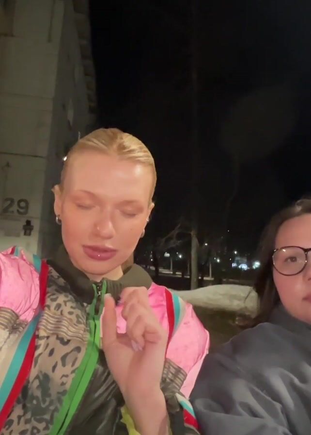 Two women are outdoors at night. The woman on the left has blonde hair pulled back in a bun and wears a pink, green, and brown jacket with leopard print detailing. She points and speaks directly into the camera. She says "Oh my god, we're back again." The woman on the right has brown hair and wears glasses and a gray jacket. She reacts to the other woman speaking. The background is a city street at night with buildings and street lights. There is a sign with the word "Notarius" in Cyrillic script.