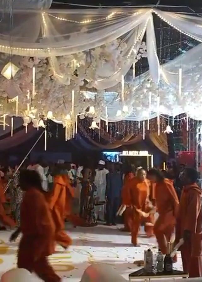 large, crowded event, possibly a wedding reception, with elaborate decorations. A group of people in orange clothing are performing some kind of dance or choreographed movement on the floor. A stage is set up in the background, decorated with balloons and flowers. There are lights and sheer fabric hanging from the ceiling. Many attendees are observing and some are recording the event.