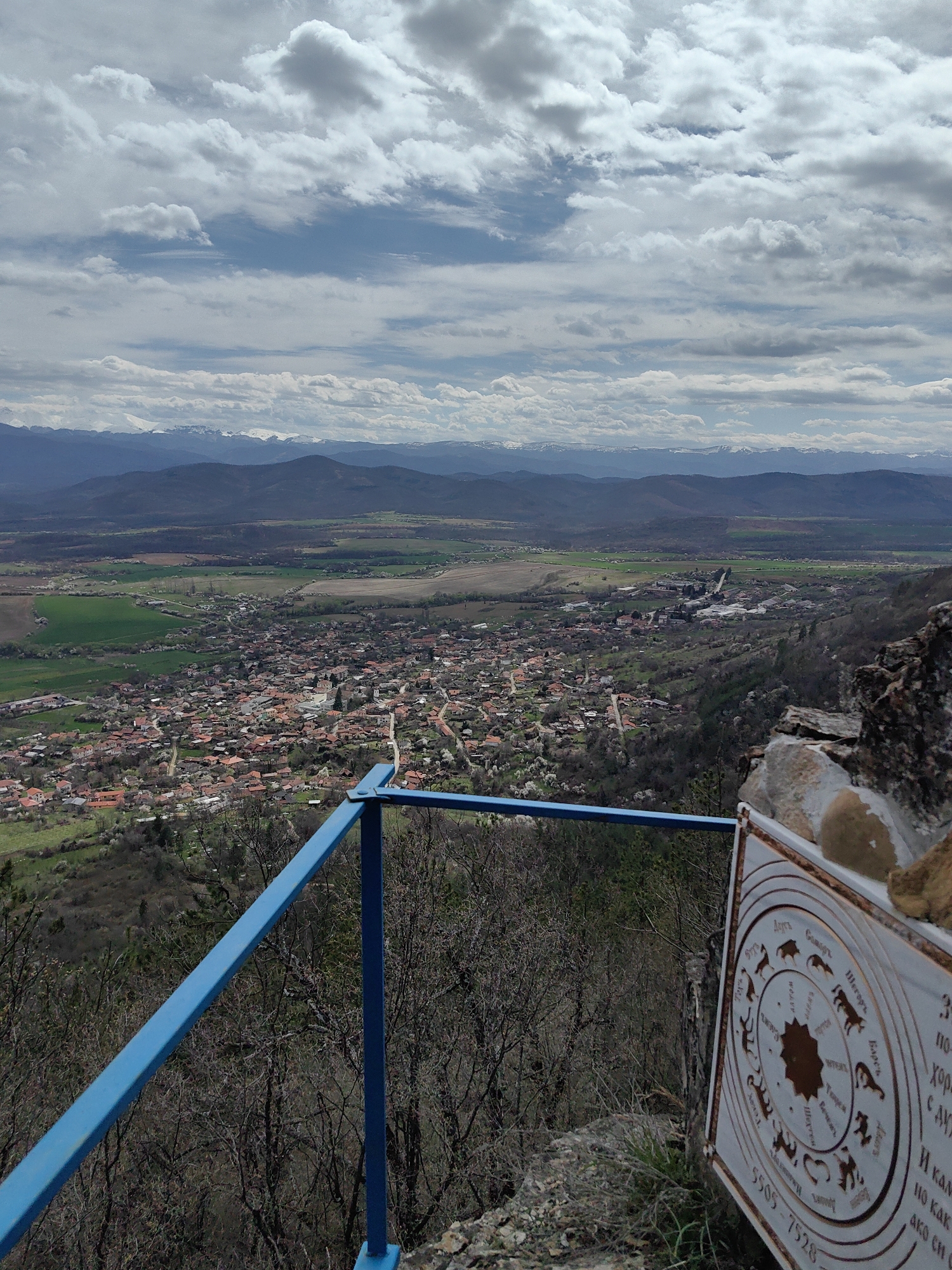 The image captures an elevated view of Vrabevo, Bulgaria, from a viewpoint adorned with a blue metal railing and a circular astrological sign