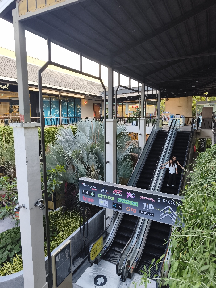 The image depicts a multi-level outdoor commercial complex in Baan Chaweng, Thailand. Two escalators are central to the frame, with one ascending and one descending. On the ascending escalator, two individuals are visible approximately midway up. The lead individual, appearing female, wears a white top and dark pants, with arms extended horizontally. A second individual is positioned directly behind her. The escalators are bordered by lush tropical vegetation, including large, fan-leafed palm trees and various shrubs. Above the escalators, a large black and white sign displays multiple brand logos (e.g., Studio, Crocs, True, AIS, JIB, Samsung) and indicates "2' FLOOR" with directional arrows. The complex features covered walkways with a dark metal roof structure supported by light-colored pillars. Shopfronts with glass windows are visible on the upper level in the background, including a partial "Central" sign. Lighting suggests daylight conditions, possibly late afternoon. An upward pointing arrow is marked on the floor at the base of the ascending escalator.
