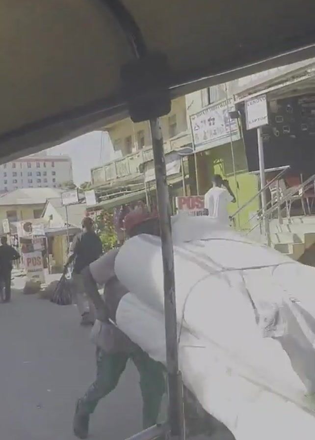 moving view from the inside of a yellow auto rickshaw or tuk-tuk, navigating a street in a busy urban environment. People walk along the sidewalks and cross the street. Several buildings and shops line the road. One person drives a motorcycle loaded with large white bags. The driver of the auto rickshaw wears a green basketball jersey with "JORDAN" printed on the back. Other vehicles are seen parked or driving. The weather appears sunny and bright.