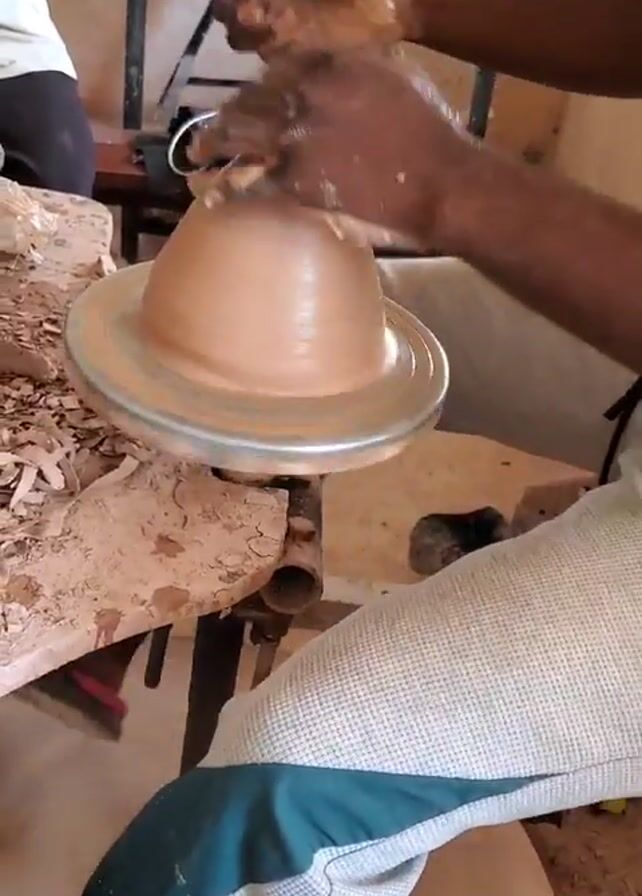 A close-up video shows a person shaping clay on a spinning pottery wheel