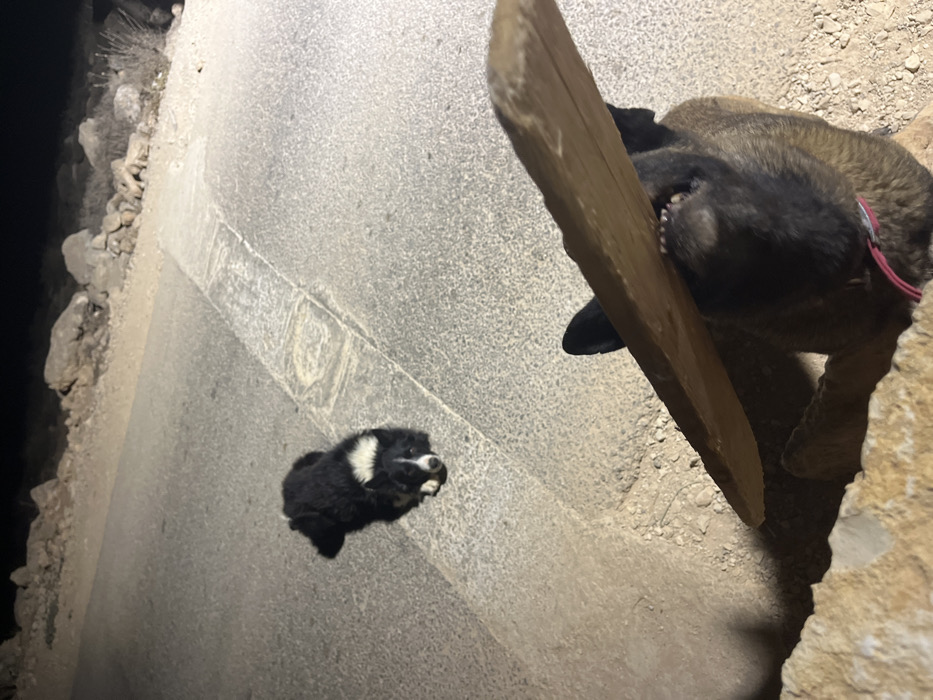 The scene depicts an outdoor night setting in Unknown, Palestinian Territory. In the immediate foreground, a fawn-colored dog, possibly a Malinois, is partially visible from the chest upwards, obscured by a light-colored stone embankment. This dog wears a pink collar and holds a light brown wooden plank horizontally in its mouth, with its teeth visible. On a grey paved road in the mid-ground, a black and white dog, consistent with a Border Collie breed, lies prone, facing the camera. The paved road features a central concrete drainage channel. The background is dark, showing unpaved ground with scattered rocks and sparse, dry vegetation. The foreground and mid-ground are illuminated by a strong artificial light source.