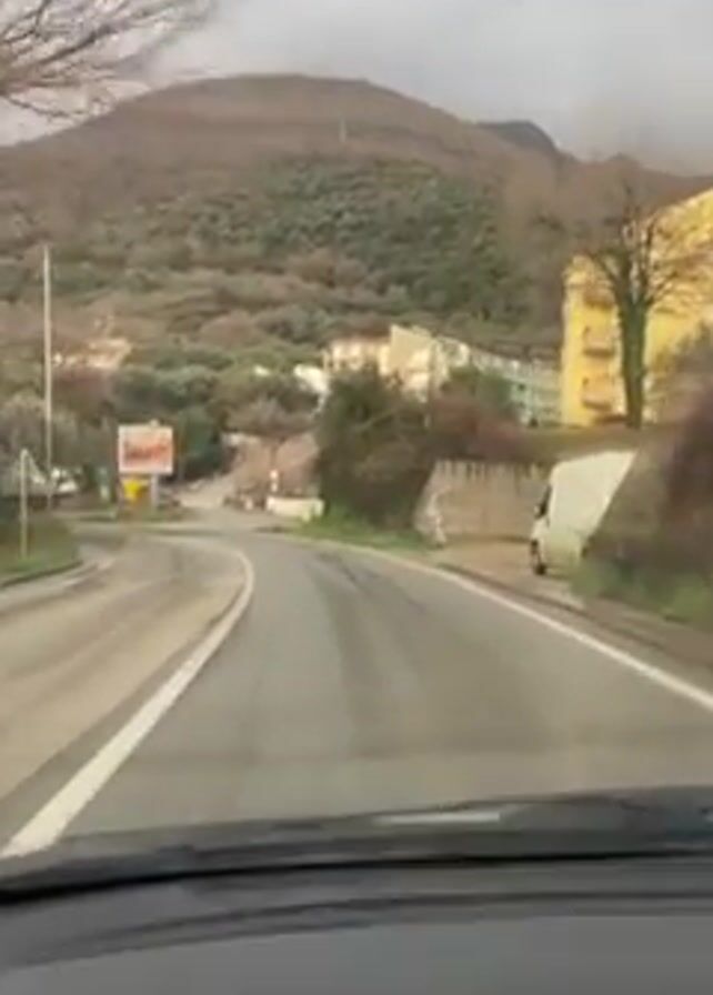 A car drives on a gray road on a cloudy day. In the distance, there is a low, tree-covered mountain. A large billboard advertising burgers sits near a junction. The road has white lane markings, and the windshield of the car is visible.