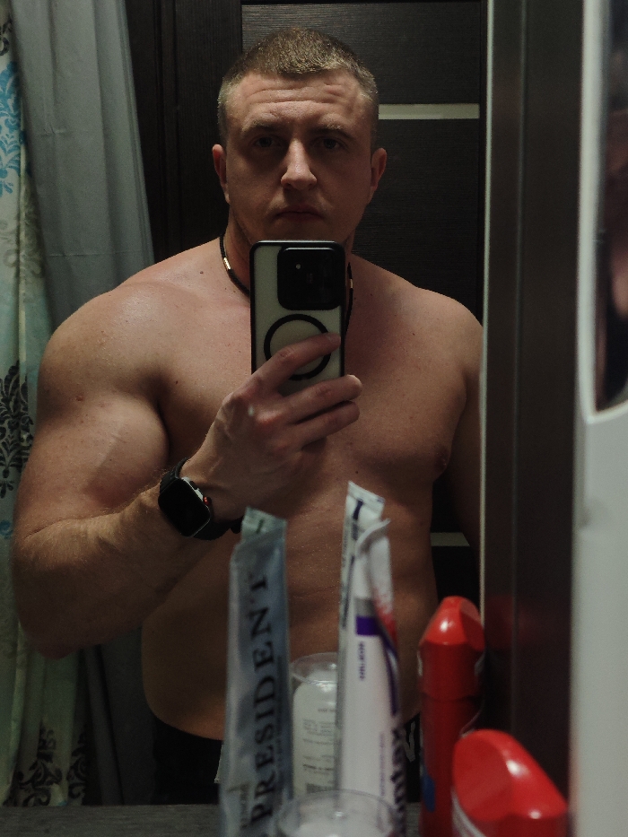 A shirtless man takes a selfie in a bathroom mirror. He has short, light-brown hair and a muscular build. A black watch is on his left wrist, and a necklace adorns his neck. In front of him on the bathroom counter are toiletries, including toothpaste tubes and a red container. A patterned curtain is visible on the left, and the bathroom door is in the background.