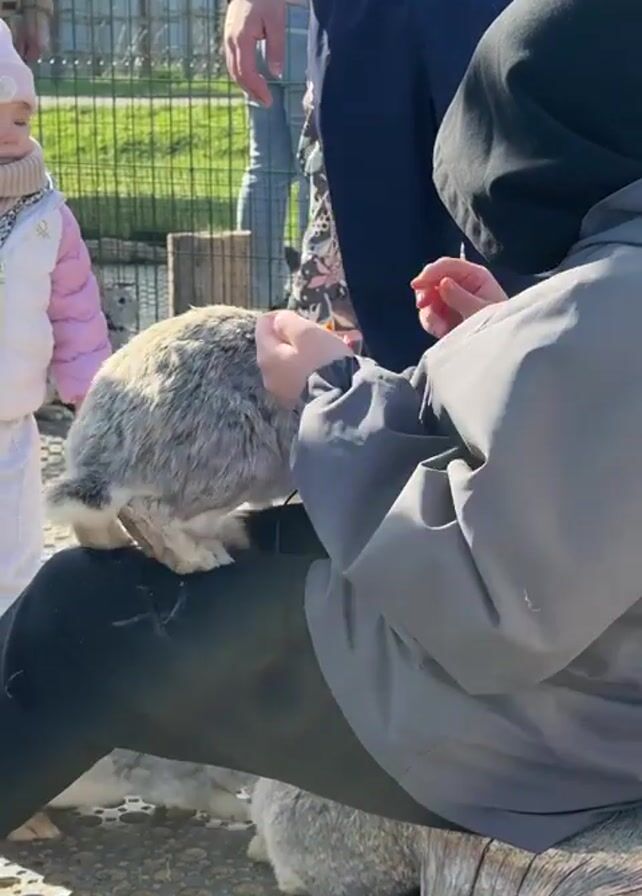 The video captures a scene involving people and rabbits in what appears to be an outdoor petting zoo or similar enclosure