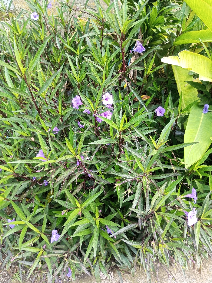 A dense bush of green leaves and purple flowers fills the frame. The leaves are long and slender, growing densely along dark, almost black, stems. Small, violet flowers are scattered throughout the foliage, adding bursts of color. A large green leaf sits on the right side of the frame, providing a contrast to the bush. The ground below is faintly visible.