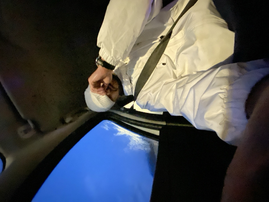 An upside-down view inside a car captures a person wearing a white jacket and cap, secured by a seatbelt. The sky is visible through the open sunroof. The person's wrist reveals a black watch. Dark upholstery and interior elements surround the subject, creating a confined setting. The image's orientation offers a unique perspective, emphasizing the person's position within the vehicle and the outside world.