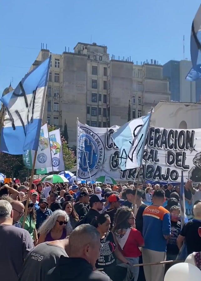 large crowd of people gathered in a public square, likely participating in a demonstration or rally. Several Argentinian flags are visible alongside banners that read "CONFEDERACION GENERAL DEL TRABAJO," which translates to "General Confederation of Labour." There is a banner with a black-and-white image of a person embracing a child. A van with photos is seen later in the video, along with an Iranian flag. The location appears to be an urban setting with older buildings in the background, featuring architectural details like white clock towers and decorative facades. The sky is clear and blue. The crowd is densely packed, with people of various ages and ethnicities. Some are carrying signs or flags, while others are simply observing. The overall atmosphere appears to be active and politically charged.