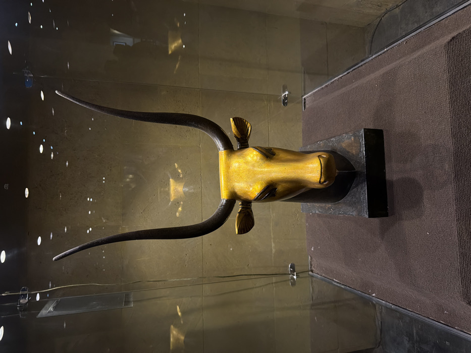 - "A golden and dark-horned bovine head statue is centrally displayed within a clear glass exhibit case" by FM-H3qiI2, licensed under CC BY 4.0