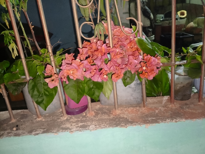 A close-up shot shows a window box or windowsill holding several potted plants. The pots are mostly obscured behind a decorative metal railing. The plants have green leaves and vibrant pink and orange flowers, suggesting bougainvillea. The pots vary in color and material. The windowsill is textured and appears to be outdoors with a muted light.
