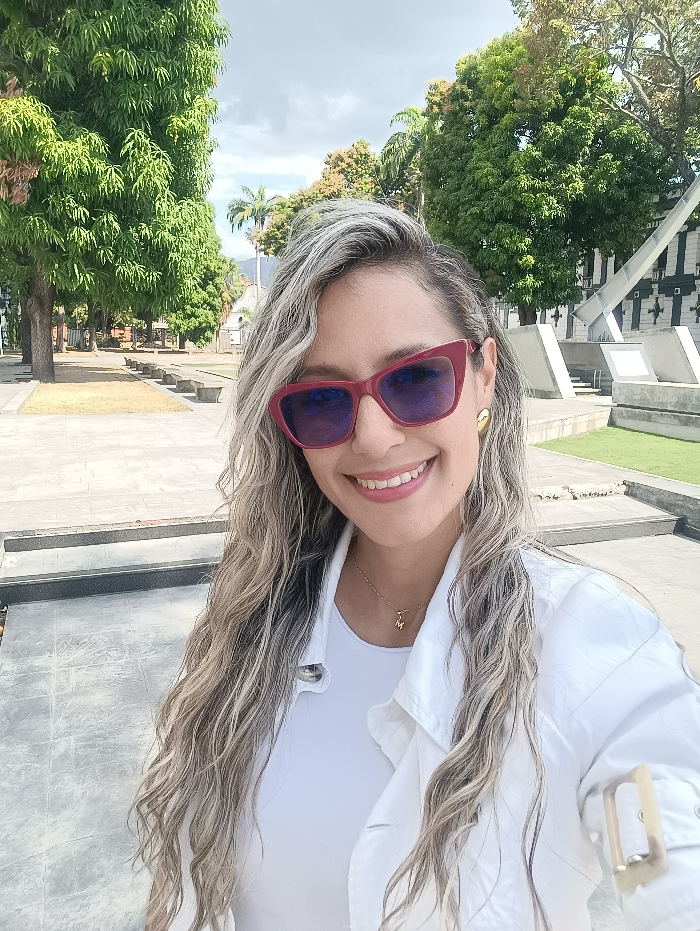 A woman with long, wavy blonde hair and red-framed sunglasses smiles at the camera. She wears a white shirt and jacket, along with gold earrings and a delicate necklace. The background shows a park-like setting with trees, grass, and a monument in the distance. The scene appears to be outdoors on a partly cloudy day.