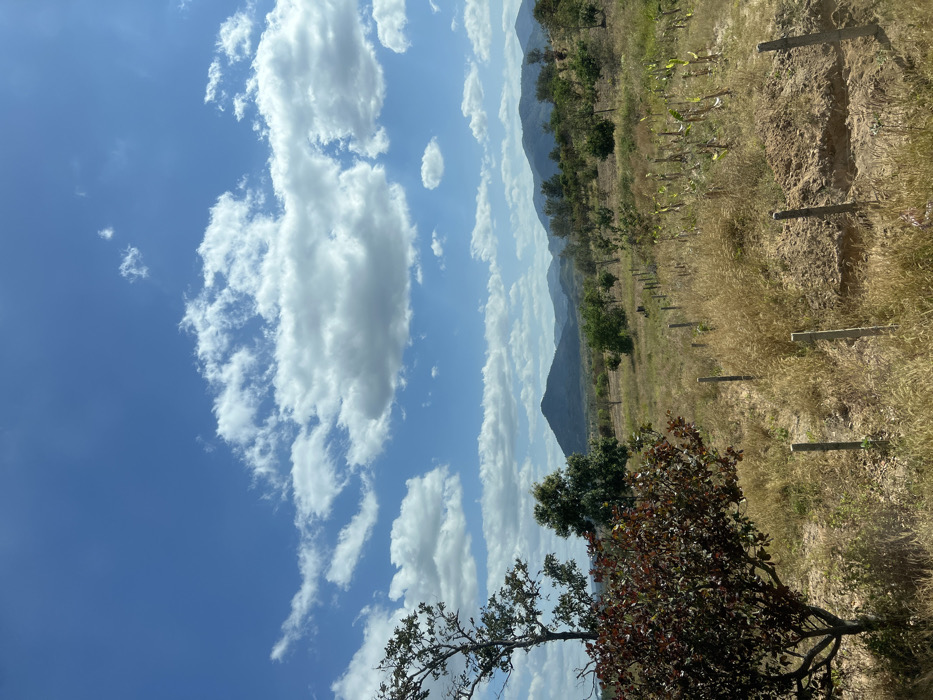 A landscape scene featuring a bright blue sky filled with fluffy white clouds. The land includes a field with rows of posts, suggesting a vineyard or orchard. Distant mountains provide a scenic backdrop. A tree with reddish-brown foliage is in the foreground, adding depth to the composition. The colors are vibrant, with the blue sky contrasting against the earthy tones of the field and mountains.