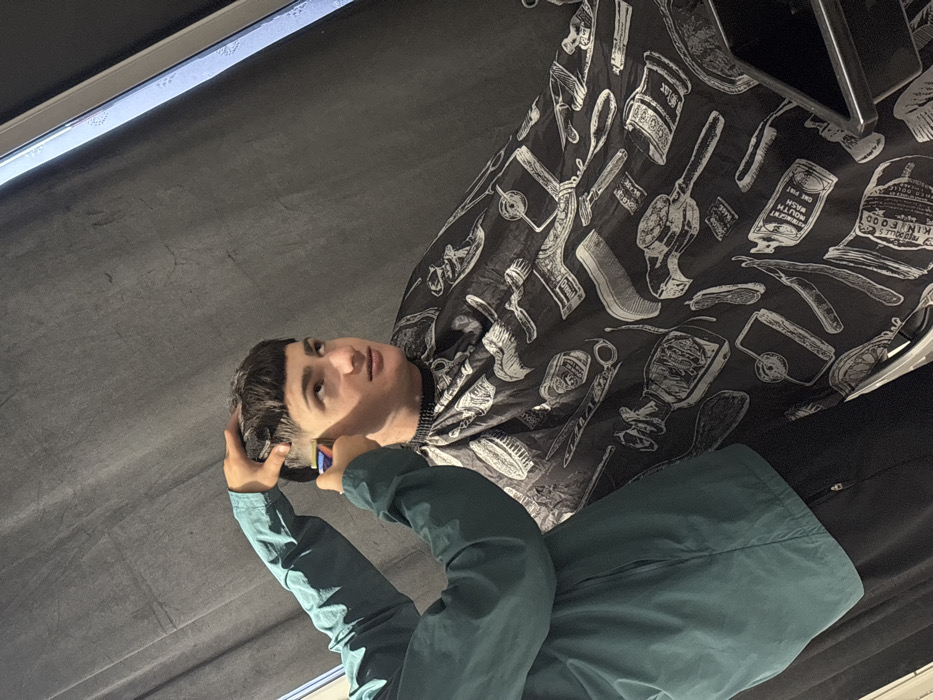 In an indoor setting in Ostwald, France, a haircut is in progress. A young male client, with dark hair styled in a bowl cut, is seated and gazes upward and to his right. He wears a black barber's cape adorned with white illustrations of various grooming tools. A barber, partially visible and wearing a teal long-sleeved jacket, operates a multi-colored electric hair trimmer near the client's right temple, while their left hand steadies the client's head. The background features a dark gray, textured curtain, with a vertical strip of bright light on the far right, suggesting a window or opening, adjacent to a dark surface below.