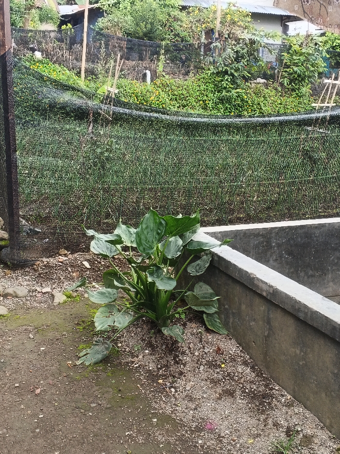 This image depicts an outdoor scene in Pinnwe, Myanmar (Burma), captured during daylight. The foreground features a large-leafed green plant, possibly an aroid, growing from a mound of soil on a dirt and gravel ground. To the right, a concrete structure, resembling a planter box or a section of a foundation, extends into the frame with a visible corner. The ground shows patches of damp earth and moss. Across the midground and background, a dark green mesh net, likely agricultural shade netting or fencing, forms a barrier. Behind this net, an overgrown area is visible, characterized by dense green foliage, numerous small yellow flowers, and scattered wooden support stakes. In the far background, parts of structures with corrugated metal roofs are discernible amidst further dense vegetation and trees, suggesting a semi-urban or residential garden setting. No people or overt actions are present.