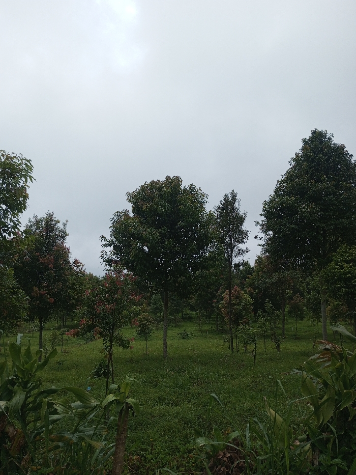 The scene depicts an outdoor, vegetated landscape situated in Nuwara Eliya, Sri Lanka, under an overcast sky. The upper third of the image is dominated by a uniform, light grey cloud cover. The midground and background are populated by numerous trees of varying heights and foliage. Predominant are mature trees with dark green leaves, interspersed with younger trees and saplings, some of which exhibit reddish-brown or lighter green new leaf growth. These trees are arranged in a manner suggesting a managed area, possibly a plantation or reforested land. The ground surface is covered densely with green vegetation, primarily grass, with taller, broad-leafed plants visible in the immediate foreground. No human subjects, artificial structures, or discernible activities are present. Illumination is consistent with natural, diffused daylight.