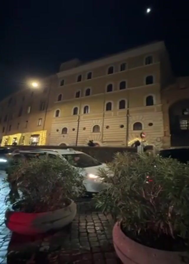 nighttime scene on a cobblestone street. There are several cars parked and driving on the street, and people are standing and walking on the sidewalk in front of a yellow building. The building has multiple floors and windows, and there is a street light illuminating the area. A crescent moon is visible in the dark sky. The camera pans to the right, showing more of the street and buildings. Plants in pots line the edge of the street.