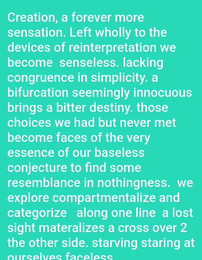 The image displays white sans-serif text against a uniform teal background, occupying the majority of the frame. The text forms a philosophical passage that reads: "Creation, a forever more sensation. Left wholly to the devices of reinterpretation we become senseless. lacking congruence in simplicity. a bifurcation seemingly innocuous brings a bitter destiny. those choices we had but never met become faces of the very essence of our baseless conjecture to find some resemblance in nothingness. we explore compartmentalize and categorize along one line a lost sight materializes a cross over 2 the other side. starving staring at ourselves faceless". No people, physical subjects, objects, actions, or interactions are visually present. The scene is purely textual and digital; no physical geographic location, including one within the city of Los Angeles, United States, is discernible from the image content.