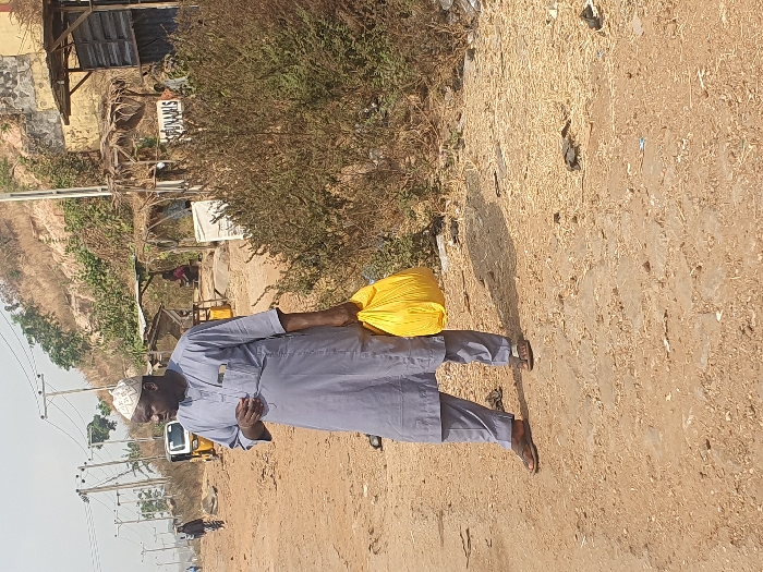 The image depicts a daytime outdoor scene located in Burwood, Australia. The foreground features an uneven dirt road composed of light brown soil, scattered dry leaves, small stones, and debris. A dark-skinned adult male stands slightly right of center, facing right and looking off-frame. He is wearing a light grey traditional tunic with matching trousers and brown open-toed sandals. A white skullcap with a subtle pattern covers his head. A pen is visible in his left breast pocket. His left hand holds dark-rimmed glasses by the earpiece, while his right hand clutches a crumpled bright yellow plastic bag. In the middle ground, on the left, a white and yellow auto-rickshaw (keke napep) is partially visible on the dirt road. Behind it, a distant figure in dark clothing walks away from the camera. Multiple wooden utility poles with overhead wires line the left side of the road, receding into the distance. The background is dominated by a dry, rocky, sparsely vegetated hill. At the base of this hill, on the right, several crude, makeshift structures or stalls are visible, constructed from wood, corrugated metal, and thatch. Indistinct figures are seated beneath these shelters. One structure features partially legible white text, possibly "DUNAWALS." A prominent bush of dense, brownish-green, dry vegetation occupies the mid-ground on the right, casting a shadow forward onto the dirt. The sky is light blue and appears hazy. No direct interaction between individuals is visible.