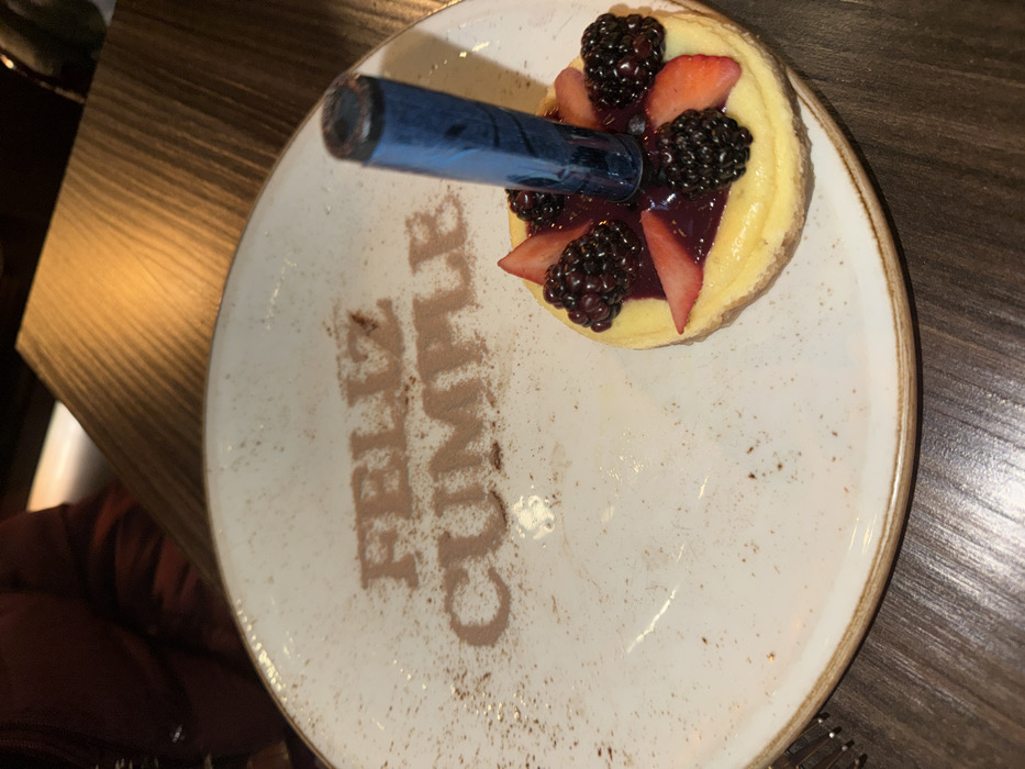 A small cheesecake adorned with strawberries and blackberries sits on a white plate. "Feliz Cumple" is written on the plate with a dusting of what appears to be cocoa powder. A small blue tube is inserted into the top of the cheesecake. The plate has a slightly speckled appearance and a simple brown rim. The surface underneath the plate is dark wood grain.
