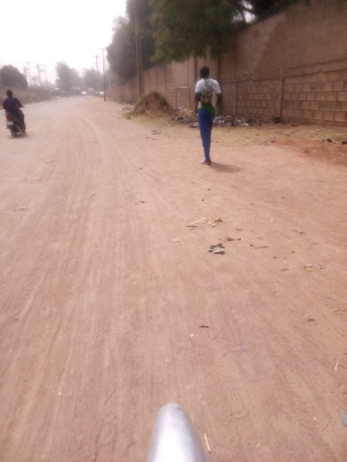 The image depicts an unpaved, reddish-brown dirt road in Gayawa, Nigeria, under a hazy sky. A male individual, wearing a white t-shirt, blue trousers, and a backpack with green and white stripes, walks away from the camera on the right side of the road. To the left, further down the road, another individual rides a light-colored motorcycle, also moving away from the camera. The right side of the road is bordered by a low, light brown concrete block wall, behind which trees are visible. Adjacent to the wall, a small mound of earth and debris is present. Scattered pieces of litter, including plastic and paper, are visible on the road surface and along the right shoulder. Utility poles are faintly discernible in the distance on the left side. The foreground shows a portion of a silver object, likely part of the photographic device, at the bottom center. The road shows tire tracks and foot impressions.