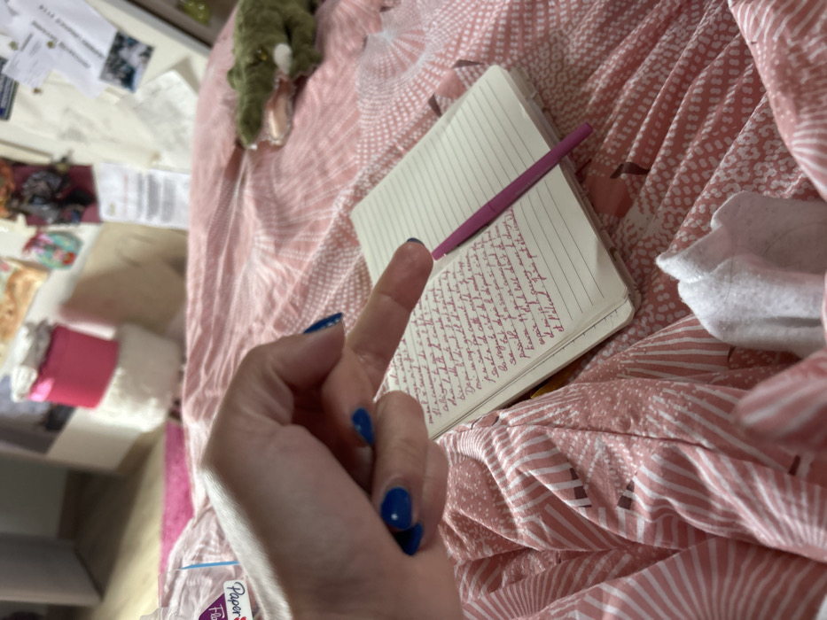 A hand with blue nail polish gives the middle finger to a notebook with handwritten text in red ink. A pink pen rests on the notebook, which is on a pink and white patterned bedspread. An alligator toy is partially visible in the upper left. A white cloth is crumpled beside the notebook on the right. The edge of a table with assorted items is visible on the left.