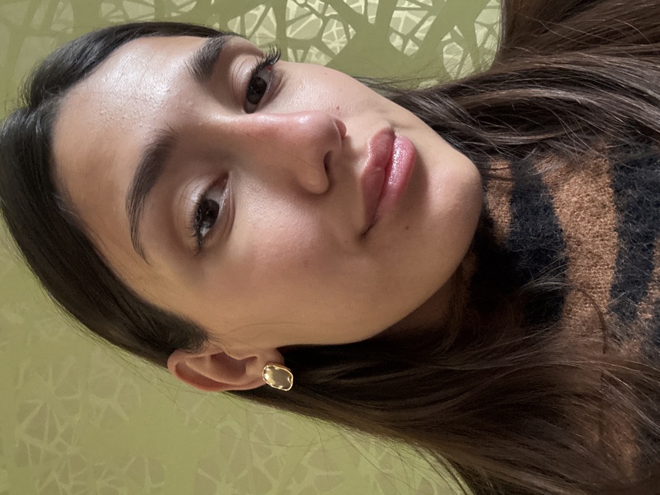 The scene depicts a close-up, indoor portrait of a female individual in Novi Sad, Serbia. The subject has long, dark brown hair, dark eyes, and well-defined eyebrows. Her skin tone is light, and her lips are full and glossy. She is wearing a brown and black striped turtleneck sweater. A single, irregular-shaped, gold-colored stud earring is visible on her left earlobe. The background consists of a light green wall featuring an abstract, interwoven pattern. The subject is positioned with her head slightly tilted, gazing directly towards the camera. No discernible actions or interactions are observed.