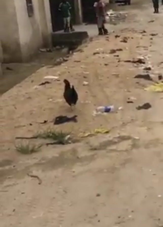 The video depicts a dirt road in what appears to be a somewhat impoverished neighborhood. There is trash scattered along the road, including a plastic bottle and pieces of discarded fabric. A dark-feathered chicken walks along the road. In the background, some children can be seen interacting near a building. A car is parked further down the street, and a couple of people are walking away from the camera. The video is shot from a handheld perspective and focused on the chicken.