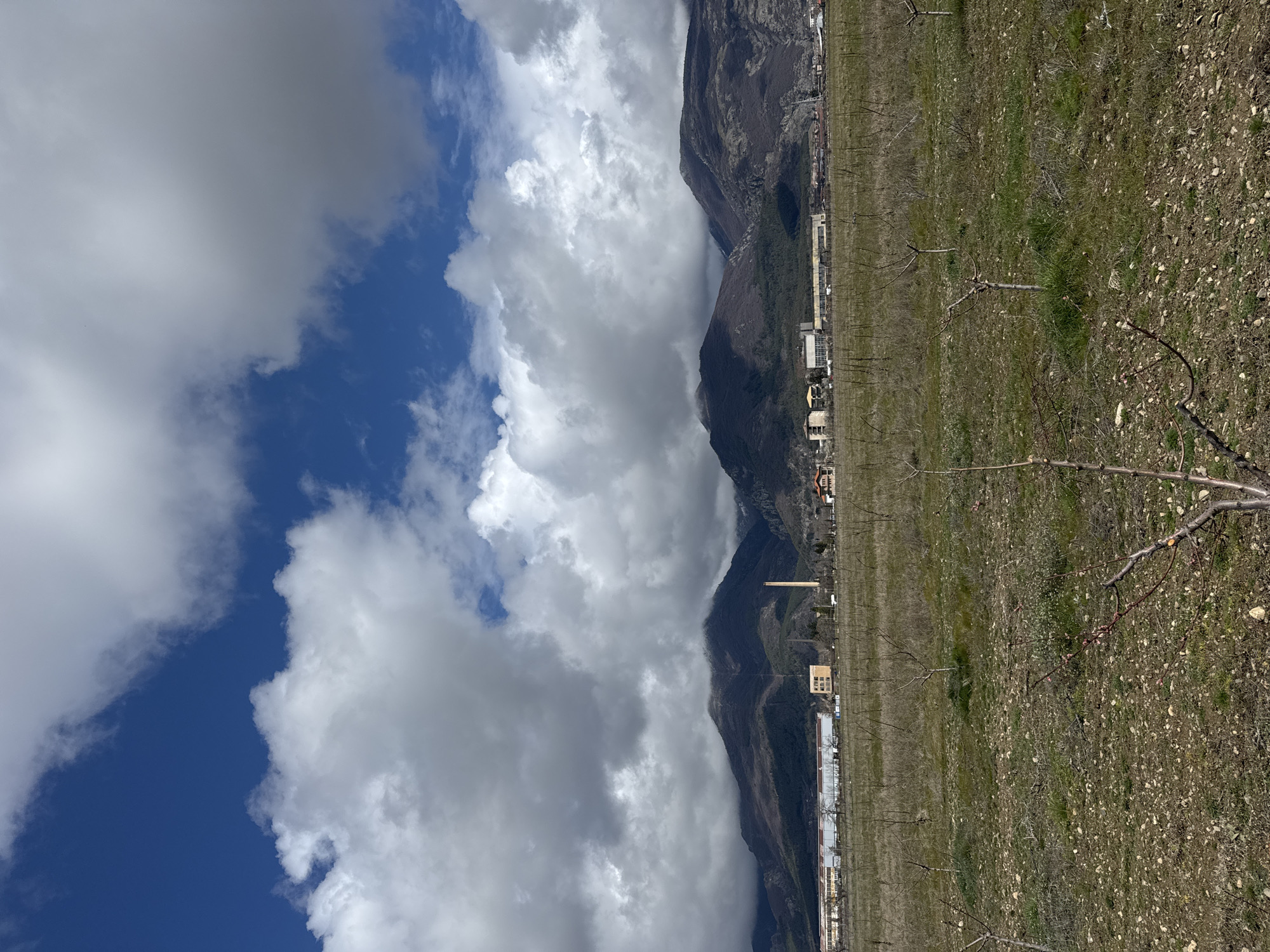 This image depicts a landscape in Sopot, Bulgaria, characterized by an open field in the foreground, an urban-industrial zone in the midground, and a mountain range in the background, all under a partly cloudy sky. The sky occupies the upper portion of the frame, displaying patches of deep blue interspersed with large, white cumulus clouds. Heavier, grey clouds partially obscure the upper slopes and peaks of the mountains in the distance. The background is dominated by a chain of dark, rugged mountains. Their surfaces exhibit a mix of sparse, dormant vegetation in brown and tan hues, interspersed with patches of darker evergreen trees and visible rock formations. The highest elevations are partially enveloped by low-lying, dense grey clouds. In the midground, at the base of the mountains, an array of buildings is visible. These include a long, flat-roofed industrial building, several multi-story structures (some appearing residential or commercial), and a prominent, tall, slender, light-brown industrial chimney rising centrally. Additional buildings, including one with a reddish-brown roof, are present further to the right. The foreground consists of an expansive, dry, open field. The ground is characterized by patches of sparse green grass, bare earth, and scattered small stones. Numerous leafless saplings or young trees are systematically arranged across the field, some exhibiting small pinkish buds, indicative of early spring or late winter conditions. No individuals, actions, or interactions are visible within the scene.