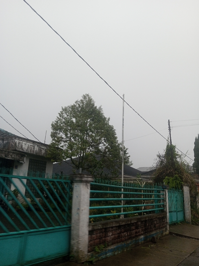 The image displays an exterior residential scene in Babaliya Mal., India, under an overcast or foggy grey sky. The lower foreground consists of a wet concrete surface. A brick boundary wall, partially visible, features a blue painted stripe along its base. A teal-colored metal gate secures a property, composed of a wider left section with diagonal bars and a narrower right section with horizontal bars, mounted between two light-colored concrete pillars. Behind the gate, a prominent deciduous tree with dense green foliage occupies the central midground. To the left of the tree, a portion of a house with a light-colored facade, a dark tiled roof, and the number "6" affixed to its exterior is visible. Its windows are covered by teal security bars. Further right, another building with a dark roof is partially discernible amidst dense green and brown foliage. Overhead, multiple dark electrical wires stretch across the frame. A slender vertical metal pole stands behind the tree, and a utility pole with cross-arms is visible on the far right, partially obscured by vegetation. No persons are present.