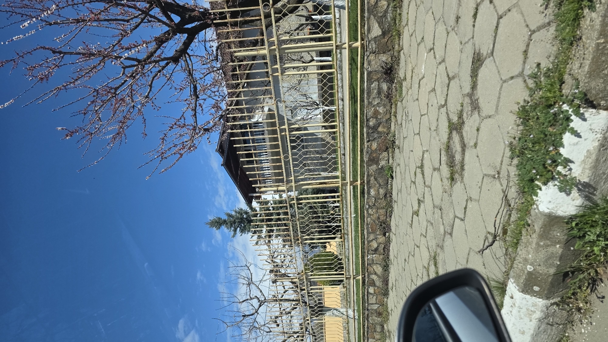 street scene in Kocherinovo, Bulgaria. On the left, a bare tree with sparse pink blossoms reaches towards a clear blue sky. A two-story house with a brown roof is visible behind a light yellow metal fence. The fence runs along a stone and concrete sidewalk paved with hexagonal tiles. Patches of grass and weeds grow along the edge of the sidewalk. A small portion of a car's side mirror is visible in the lower right corner of the frame. The overall impression is one of a quiet residential street in early spring.